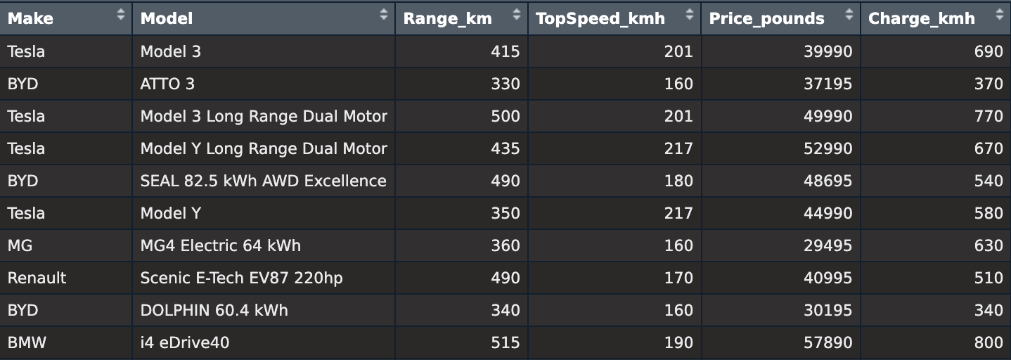 An example observation is “Tesla Model 3,” with the following data: Make: Tesla, Model: Model 3, Range_km: 415, TopSpeed_kmh: 201, Price_pounds: 39,990, Charge_kmh: 690.