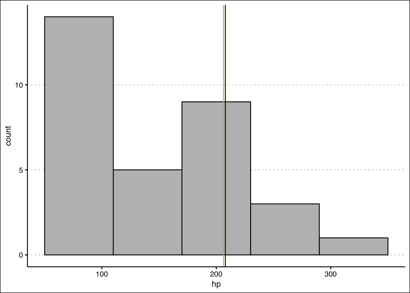 In R we can construct a histogram with vertical lines for the mean and median with the following code: