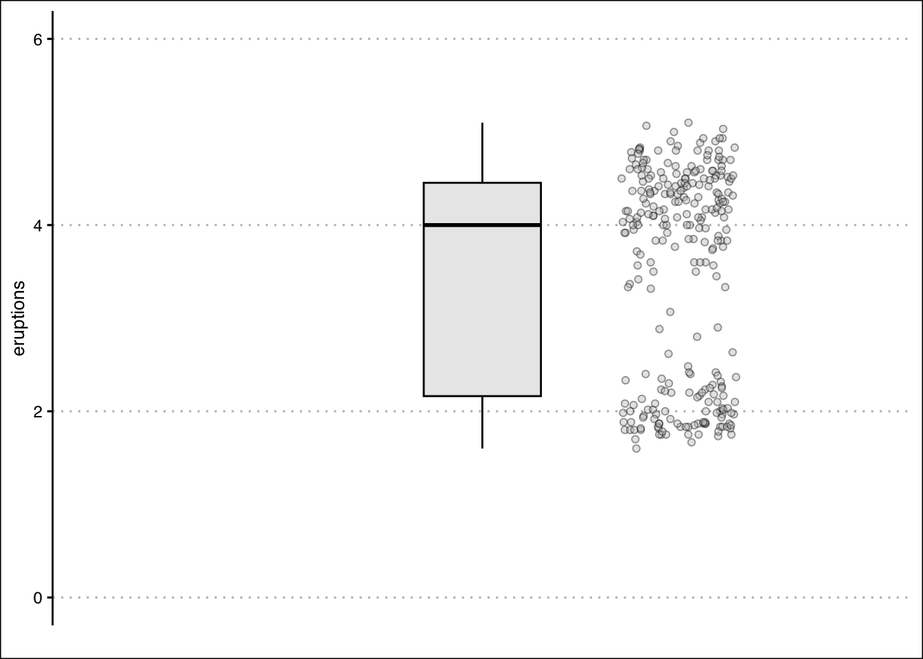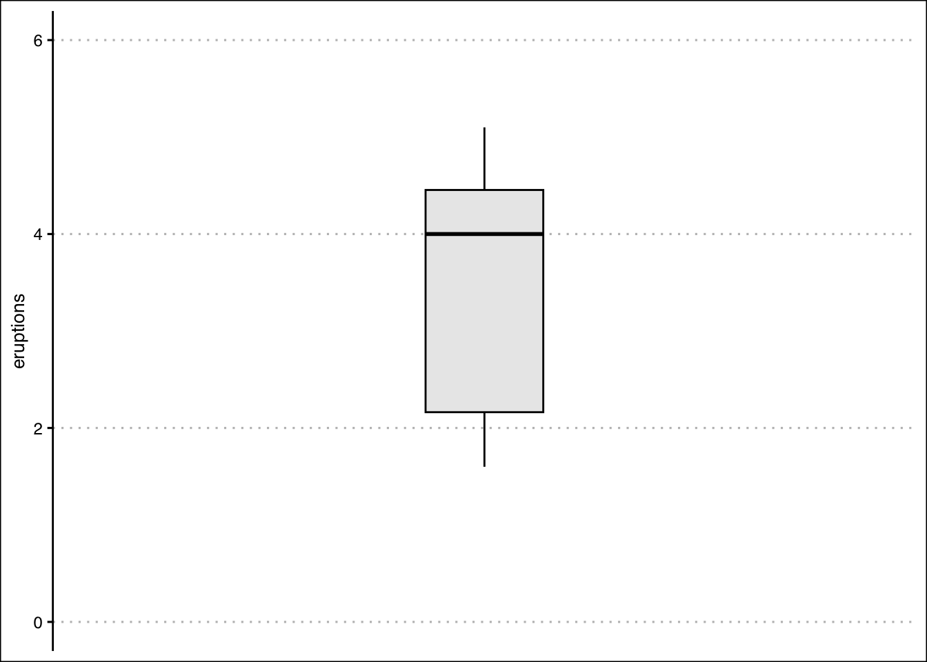 A box plot is a graph that shows the five point summary, outliers (if any), and the distribution of data. It can be easily constructed using geom_boxplot() in R. Let’s use the eruptions variable once more.
