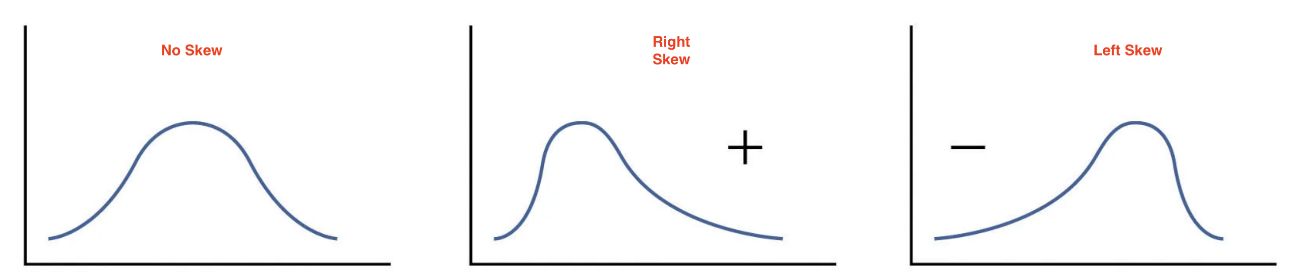 A measurement of skew, identifies asymmetry in the distribution of data. If most of the data leans towards one side, it’s skewed. If it leans to the left, it’s left-skewed or negatively skewed, meaning the tail on the left side is longer. If it leans to the right, it’s right-skewed or positively skewed, with a longer tail on the right. If the data is evenly distributed, it’s not skewed at all, it’s symmetric. To determine if the data is skewed, calculate the Pearson’s Coefficient of Skew. \(Sk=\frac{3(\bar {x}- Median)}{s_x}\). The distribution is skewed to the left if \(Sk<0\), skewed to the right is \(Sk>0\), and symmetric if \(Sk=0\).