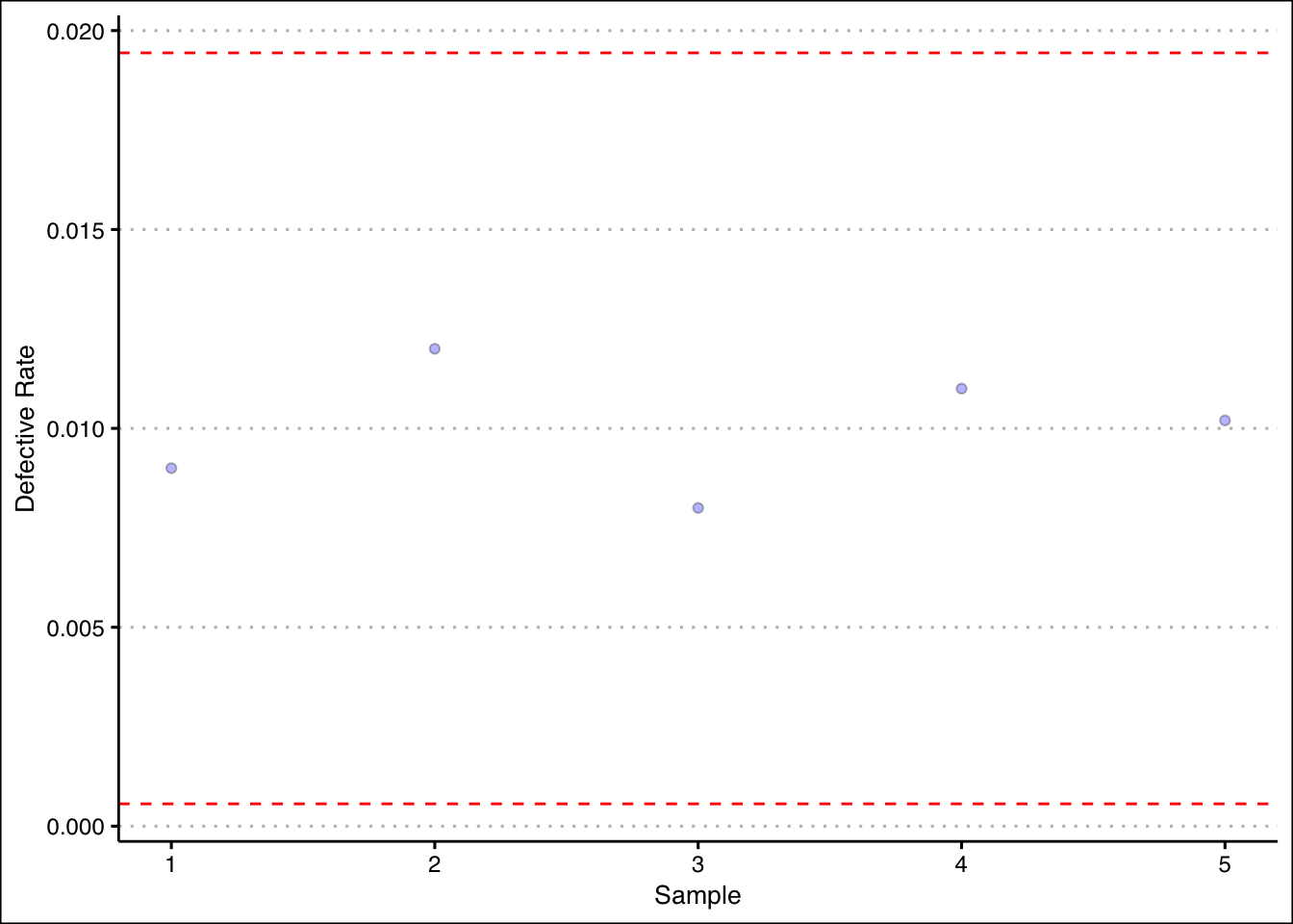 - The production of Good Guy dolls has a \(1\)% defective rate. A quality inspector takes five samples of size \(1000\). The proportions are shown in the table below. Is the production process under control?