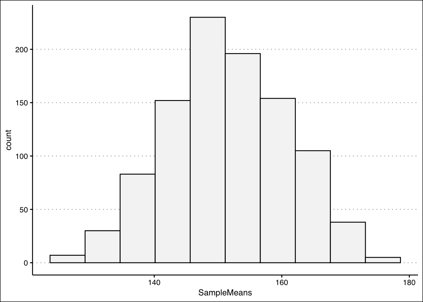 - Create a histogram for the sample means. Is the distribution uniform? Is it normal? What is the probability that the sample mean is between 140 and 160?